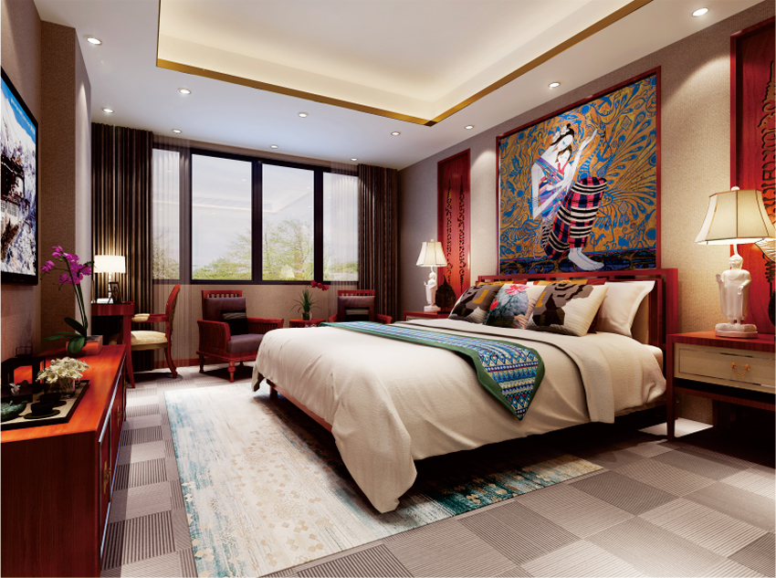设计时尽力的去避免图案和造型这种人为的元素创造,而是采用原木背景墙及富于东南亚风情的元素组合,在垂直界面用具有东南亚文化的装饰画及陈列品体现空间风格,用大量的手工痕迹来拉近空间与人的距离。